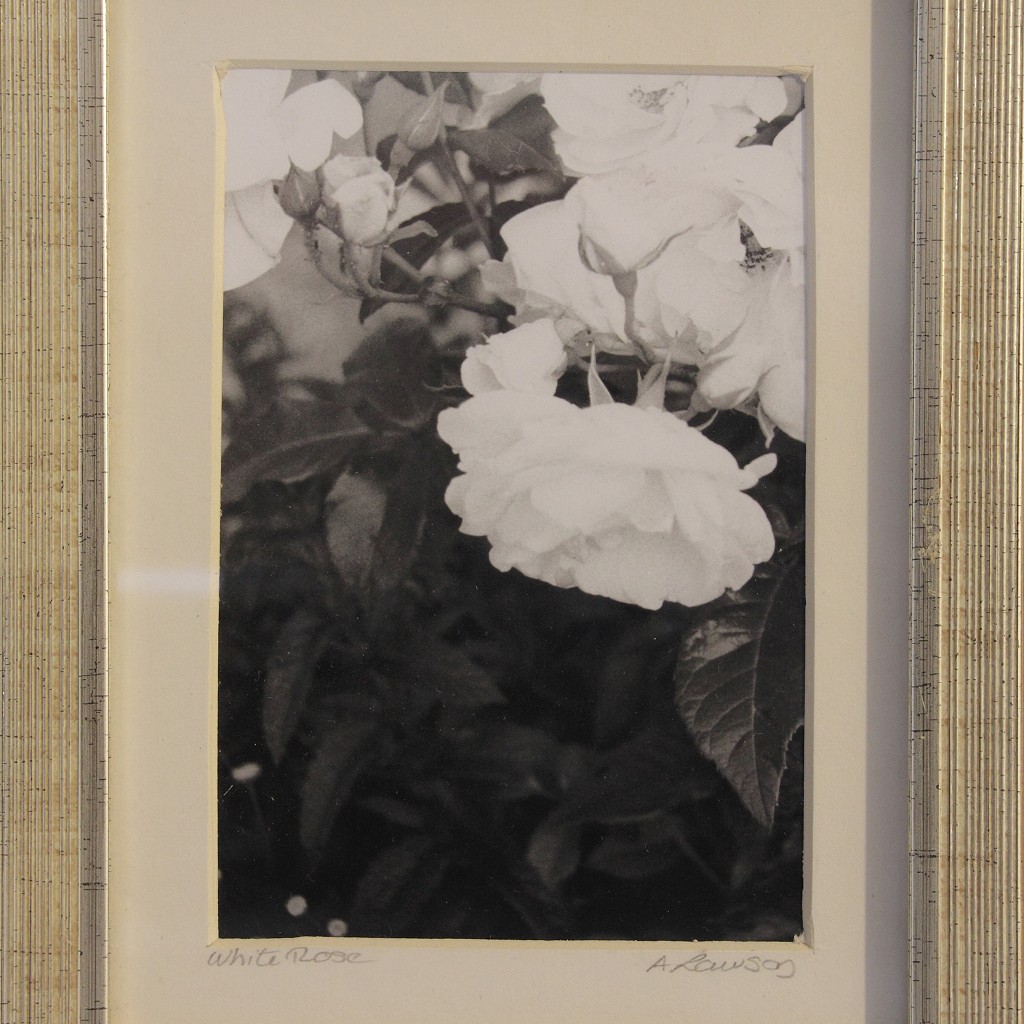 Black & White white rose photograph in a metallic frame 9 1/2" x 7 1/2"
