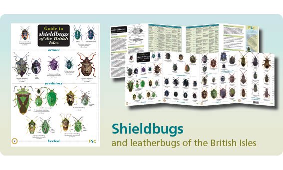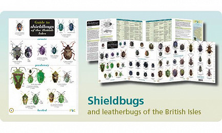 This 8-panel laminated fold-out chart includes colour illustrations of 45 shieldbugs and a table of identification characteristics. Coverage includes the families Acanthosomatidae, Cydnidae, Scutelleridae, Thyreocoridae, and Pentatomidae, as well as the 'honorary shieldbugs' from the family Coreidae. In this guide species have been grouped by appearance and where the nymph is distinctive it is shown as well as the adult.